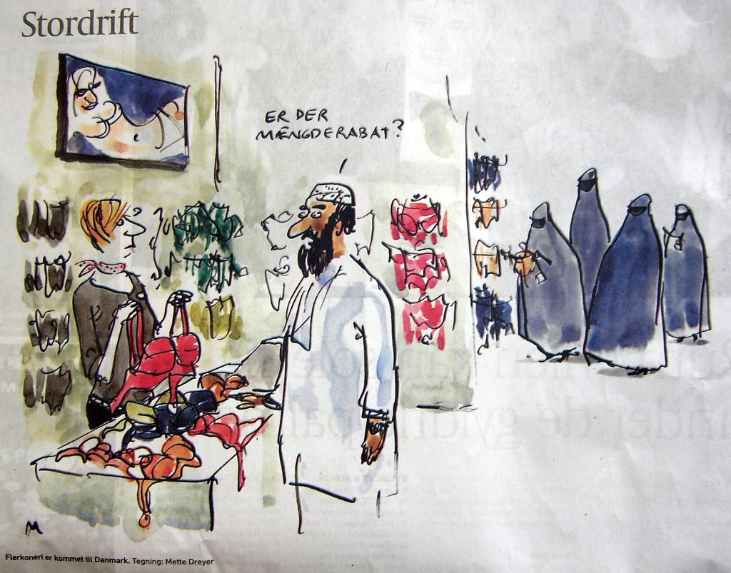 If immigrants with several wives settle in the Netherlands, the local authorities register all the marriages. However, the Central Bureau for Statistics (CBS), where all marriages are registered nationally, removes these bigamous or polygamous marriages from its files, on the assumption that administrative errors have occurred. As a result, it is not known how common the phenomenon is in the Netherlands……Amsterdam city council has informed the CBS that the marriages are not a mistake……… “”At present, it is not included in our statistics,” Latten pointed out. “In the same way, we delete marriages involving fourteen-year-olds. A man with two wives just cannot exist by law.” Nisnews (klik tegning)