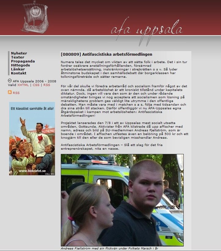 Antifascistiska arbetsförmedlingen :  Numera talas det mycket om vikten av att sätta folk i arbete. […….] Därför offentliggör vi nu AFA-Uppsalas egna åtgärdspaket i kampen mot arbetslösheten: Antifascistiska Arbetsförmedlingen!