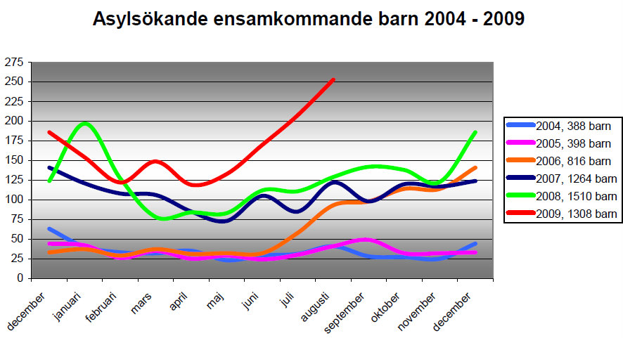 Inströmningen av barn och ungdomar fortsätter ligga på en mycket hög nivå. I dagsläget är Somalia och Afghanistan de överlägset största nationaliteterna. Migrationsverket har till och med den sista augusti tagit emot 1 308 ansökningar om asyl från ensamkommande barn och ungdomar, varav 253 ansökningar under augusti månad.