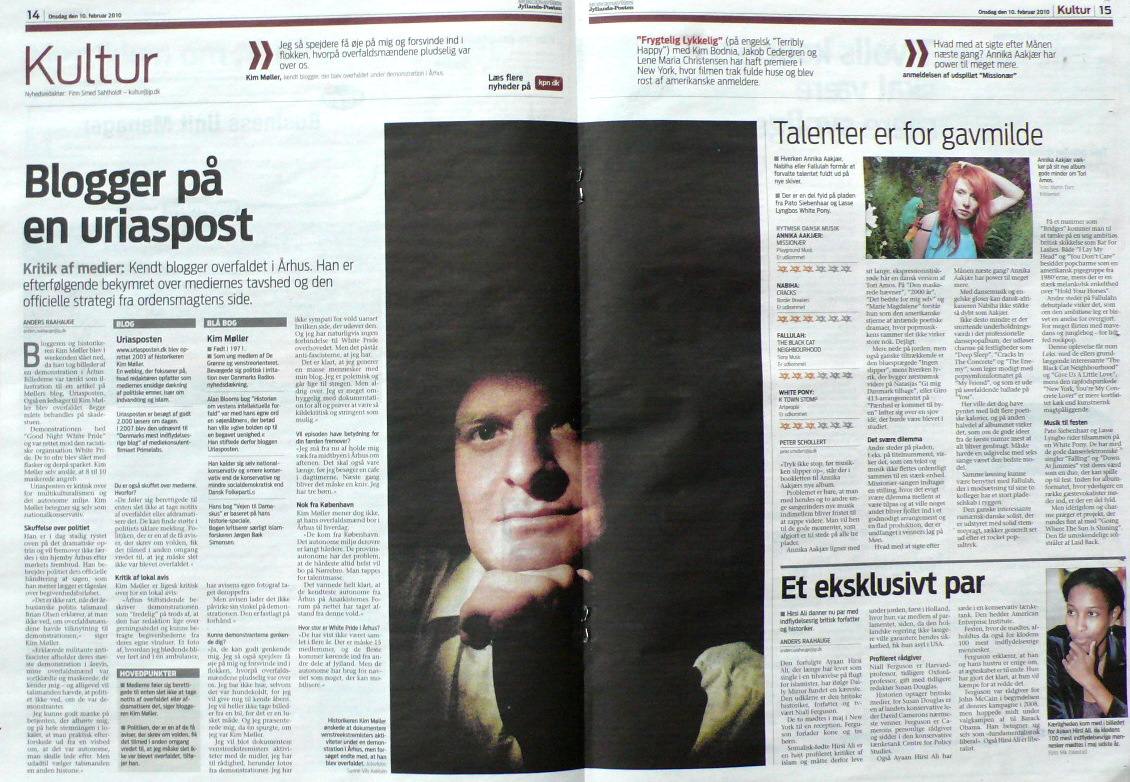 Kendt blogger overfaldet i Århus. Han er efterfølgende bekymret over mediernes tavshed og den officielle strategi fra ordensmagtens side.Bloggeren og historikeren Kim Møller blev i weekenden slået ned, da han tog billeder af en demonstration i Århus.Billederne var tænkt som illustration til en artikel på Møllers blog, Uriasposten.Også en ledsager til Kim Møller blev overfaldet. Begge måtte behandles på skadestuen. De to ofre blev slået med flasker og derpå sparket. Kim Møller selv anslår, at 8 til 10 maskerede angreb.