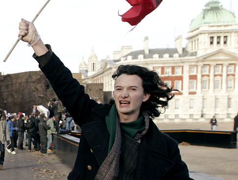 In this Thursday Dec. 9, 2010 photo, Charlie Gilmour, the son of Pink Floyd guitarist David Gilmour, holds a flag with the word ‘revolution’ on it as he marches along Horse Guards Road, as Horse Guards Parade can been on the right, during a demonstration in central London against government plans to triple tuition fees. Charlie Gilmour has issued a public apology for climbing on top of one of Britain’s most important war memorials and trying to rig a British flag during the violent student protests against rising university fees. He added in a statement Friday Dec. 10, 2010 that he was ashamed for his ‘moment of idiocy’ and he did not realize the Cenotaph in central London commemorates Britain’s war dead. (AP Photo/Matt Dunham) Original Filename: Britain Charlie Gilmour.JPEG-0ea3d.jpg