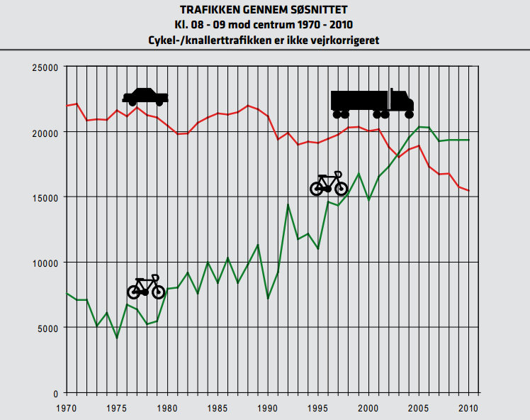 Så nu skal hele byen ligne Vorbasse Boulevard på en søndag i kirketiden, eller det Nørrebrogade som Klaus Bondam fik begået et næsten vellykket, radikalt mord på. København er en metropol, der skal møbleres om efter model Virum, dødens ultimative forstadspølse, og Helle Thorning er parat til at begå harakiri, for at gennemføre SF-ernes provinsielle tvangstanke, men gennemfør det endelig og vis os at S kan komme ned under 20 %. Måske man skal være glad for, at RAF regeringen holder sig til “de nære sager,” hvad kunne de ikke forkludre, hvis de begav sig på de større linjer? Trafikken gennem kommunegrænsen og søsnittet 1970-2010. – Steen, blogger og heldigvis snart cyklist igen.