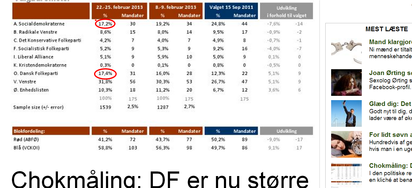 For første gang nogensinde er Dansk Folkeparti større end Socialdemokraterne i en vælgermåling. Det er historisk. »Målingen er en katastrofe for Socialdemokraterne, fordi den rammer dybt ind i den socialdemokratiske selvforståelse som et stort regeringsbærende parti. Det er jo ikke mange år siden, Nyrup kaldte Dansk Folkeparti ikke-stuerene,« siger Helle Ib, Børsens politiske kommentator.Chokmåling: DF er nu større end S, Dansk Folkeparti större än Socialdemokraterna. Dansk folkeparti och (S) lika stora Dansk folkeparti ikapp (S)(klik grafik)