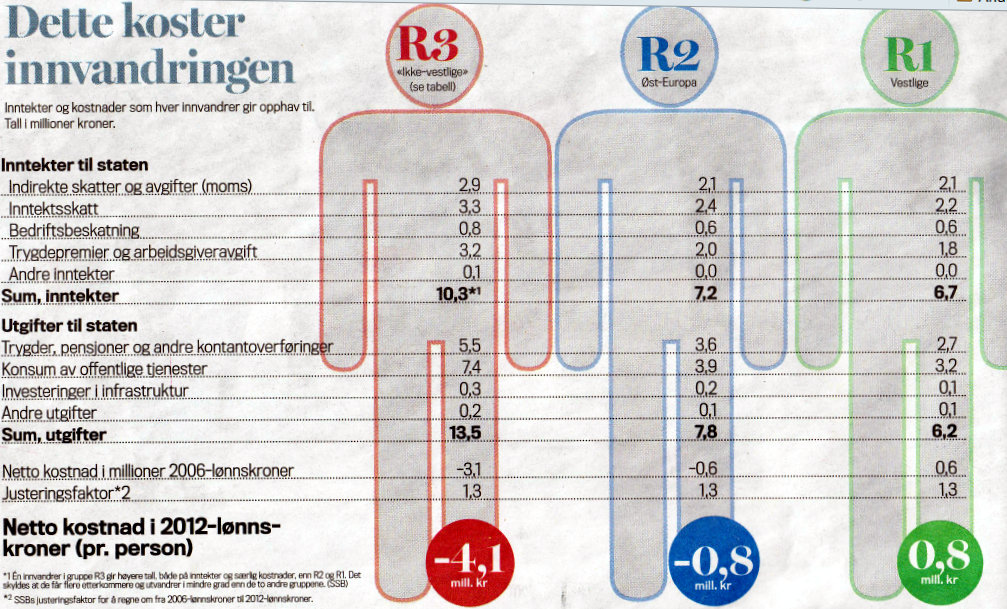 SSB er Statistisk sentralbyrå i Norge. Talende tavshed på VG, Aftenposten og NRK. Dette er et meget kort referat fra Finansavisen, der har fem sider i dag. Jeg har fået det indscannet og skal lave en sammenfatning. Tallet er overraskende, for i Danmark har Cepos regnet ud at de kun koster det halve: Cepos: ikke-vestlig indvandrer koster 2 mio. kr. på 70 år – Det samme gælder deres efterkommere Det kan regnes ud på mange forskellige måder. Lone Nørgaard nævner i dag i Fyens Stiftstidende (ikke online) nogle af de udgiftsområder, der næppe alle er med i nogen af udregningerne: