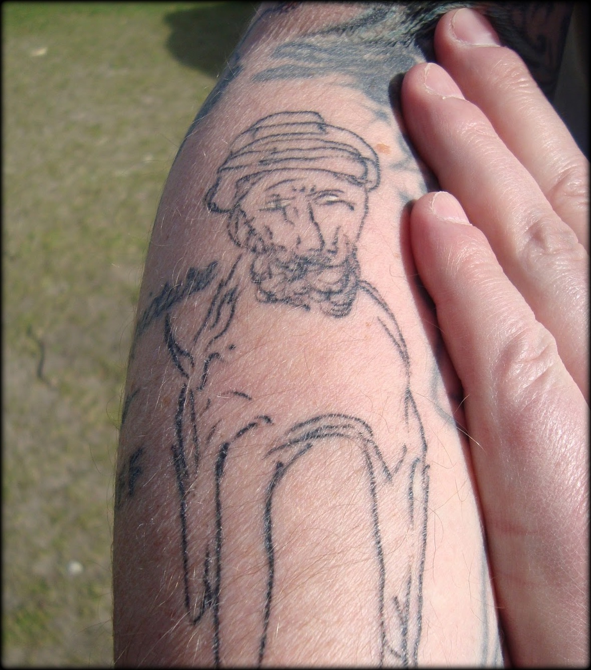 Set til 1. maj i Kildeparken i Aalborg.Tatovering med den svenske kunstner Lars Vilks ‘ tegning af religionsstifteren Muhammed som en rondellhund (rundkørselhund) som motiv. Tatovering med Kurt Westergaard ‘s Muhammed-tegning som motiv. På Westergaards tegning står den islamiske trosbekendelse skrevet henover Muhammeds turban. På tatoveringen er trosbekendelsen udskiftet med et billede af en lyserød gris.Muhammed tatovering og rondellhund tatovering.