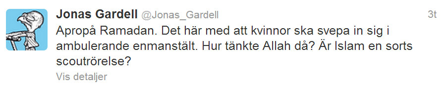 Jonas Gardell er Sveriges rigsbøsse. Alle ved, at der er mange ‘islamofober’ i Sverige, men rigsbøsserne ved de ikke noget om. Han er mediernes og politikernes gennem mange år kølerfigur for homo-sagen, altså som stjernen på køleren af en Mercedes. Hvis han ikke var på TV og radio, ville de miste halvdelen af programfladen. Nu skal han passe på, at Qaradawi ikke udnævner ham til dagens islamofob ligesom han gjorde med Robert Redeker, for så er det slut med at færdes offentligt resten af rigsbøssens liv og han kan flytte ind hos Lars Vilks. Foreløbig er det kun det sædvanlige moralpoliti, der er efter ham, men det kan eskalere. Gardell i blåsväder på twitter