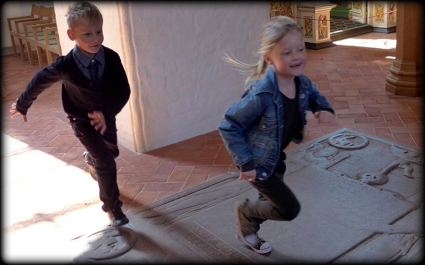 den lille pige, der stormer hen over ligstenen med kraniet – hvor er det? Holmens Kirke?