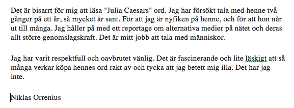 – Jag har knackat på hos henne två gånger, med ett års mellanrum, och skickat ett mejl, eftersom jag inte haft något telefonnummer till henne. Jag har varit hövlig och velat ha kontakt för en intervju, det är bisarrt att läsa hennes beskrivning av detta, säger Niklas Orrenius. Han vill inte gå in på hur DN hanterar hoten, eller om de ska polisanmälas. DN har ännu inte publicerat något reportage där ”Julia Ceasar” figurerar. Niklas Orrenius: “Det har varit två nätter med hat- och hotsamtal”. Journalisten: Mordhot mot DNs Niklas Orrenius – Se også Hans Rustad: Orrenius har fått pågang og ubehageligheter og Ingrid Carlqvist: Journalisternas dödsryckningar