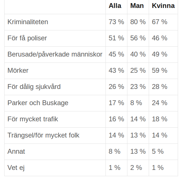 Den främsta anledningen till att svenskarna känner sig otrygga är oro för kriminalitet, det svarar hela 73 procent. Därefter är för få poliser och berusade människor de vanligaste anledningarna till att man är otrygg i sina städer. Ett annat orosmoment, främst bland kvinnor, är mörkret. Hela sex av tio kvinnor känner sig otrygga efter skymning. Därför känner sig varannan svensk otrygg. – Polisens varning: Lås även om du är hemma.