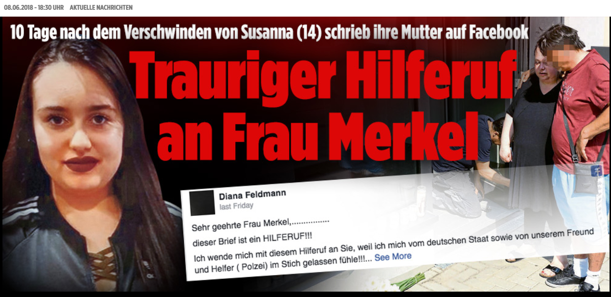 Flere flove, tyske mediehistorier: Zentralrat der Juden trauert um getötete Susanna, „Erhebliche Kontrollpanne“: Wie konnte es passieren, dass Ali B. ausreiste?, Tatverdächtiger im Fall Susanna (14) wieder freigelassen. Fall Susanna F.: Trauer bei Mitschülern, Angehörigen und Bekannten.Presset på Merkel siger, se video.