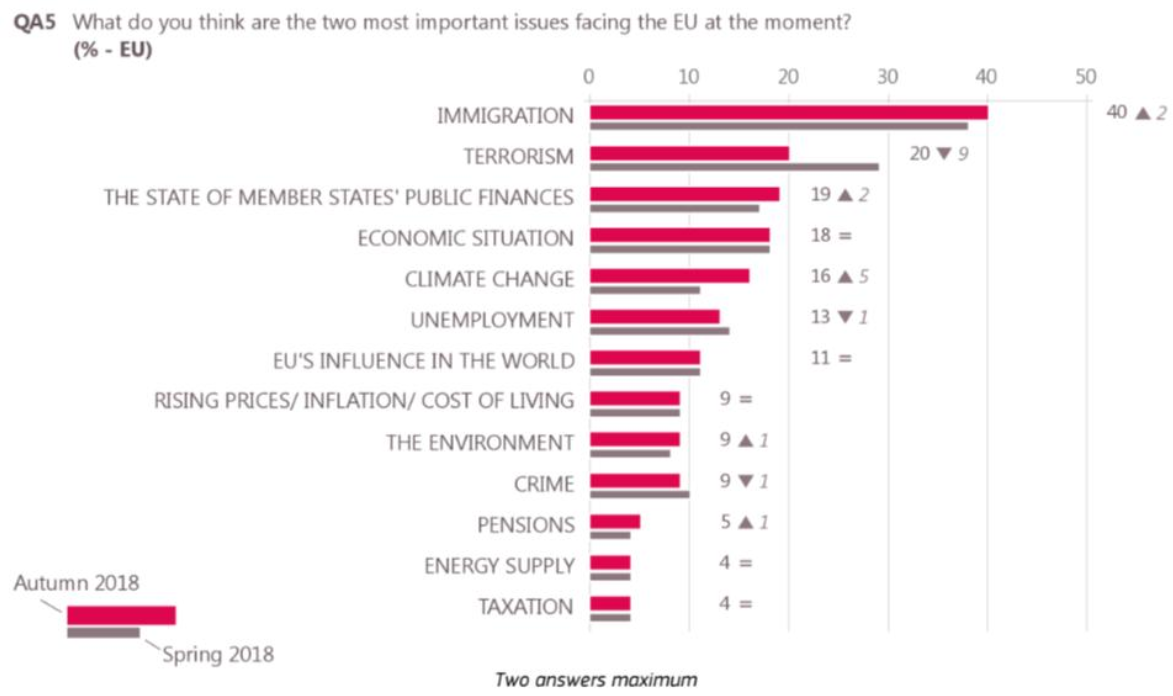 En anden elitetvangstanke er “klimaet.” Europas folk finder ikke klimaet særlig vigtigt, mindst vigtigt finder Skandinaverne det, hvis man ser på Standard Eurobarometer 90 Autumn 2018: