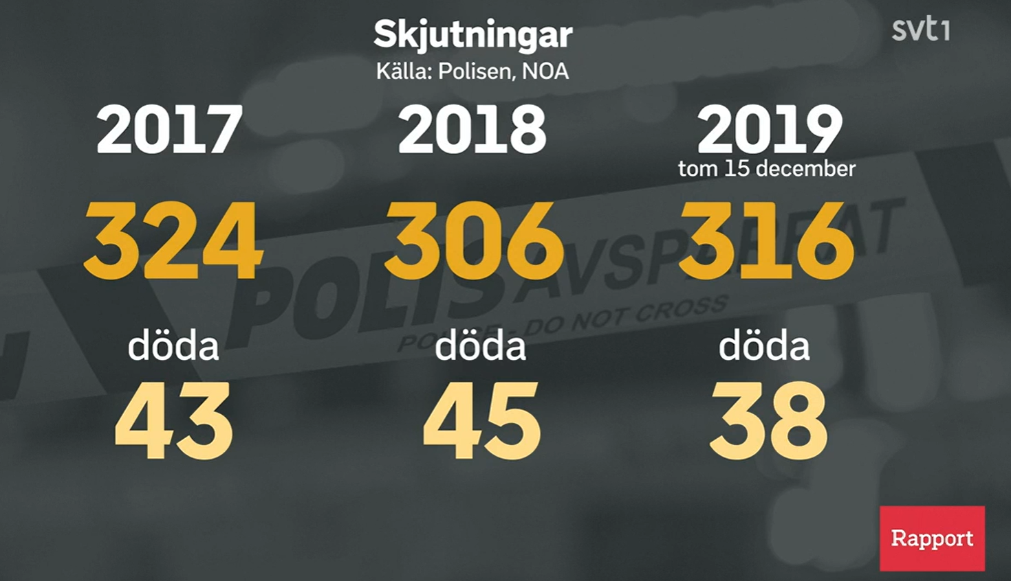 Se også Sweden: The New Tribalism. I aftes havde SVT Rapport denne statistik. Som man ser, lader skyderierne sig knapt nok afficere af retsstatens hidtidige indsatser. Ingen af dens forholdregler har gjort noget indtryk, og uret tikker videre.