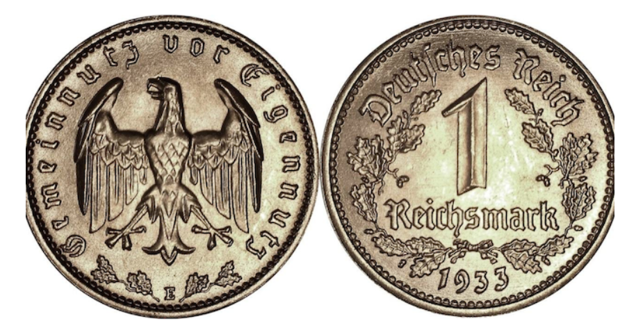 Sloganet, som er præget ind i møntens kant, lyder på originalsproget: Gemeinnutz geht vor Eigennutz. Mønten er en 5 Mark fra 1937 med ørn, hagekors og påskriften Deutsches Reich. Det løb mig bogstaveligt talt koldt ned af ryggen, da jeg ved hjælp af en lup havde dechifreret de gotiske bogstaver på møntens kant.