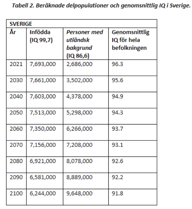 Tabell 2 visar att nivån på det genomsnittligt IQ i Sverige sjunker till 92 år 2100 om inga betydande förändringar sker i nettoinvandringen. Dessa värden för IQ visas också i figur 1, som även visar motsvarande resultat för Danmark, Norge och Finland.