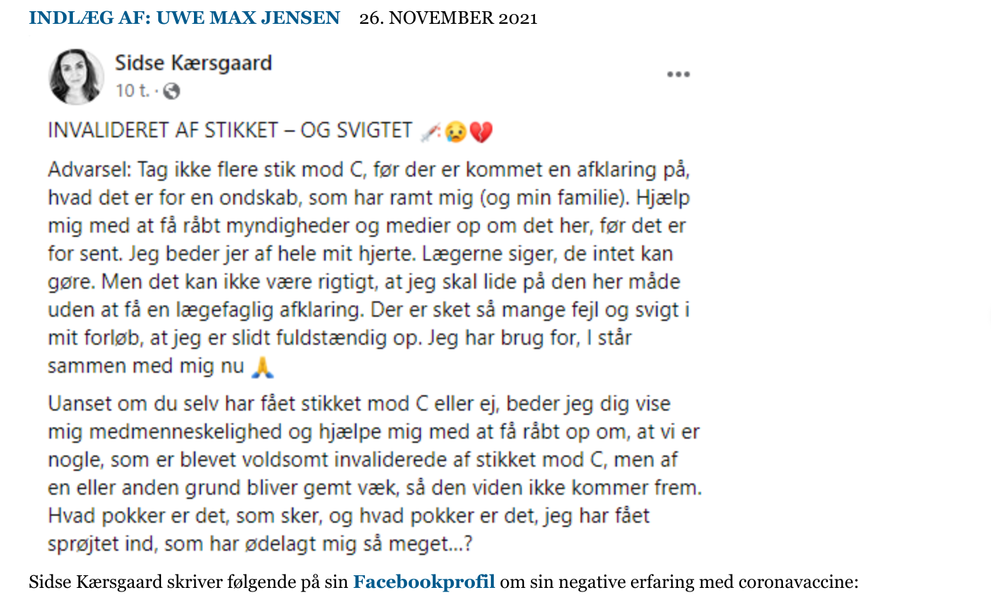 Sidse Kærsgaard skriver følgende på sin Facebookprofil om sin erfaring med coronavaccine. Indlægget er siden slettet men her gengivet af Uwe Max Jensen. Kan det medvirke til at skåne andre for samme desperate skæbne, må det gøres offentligt. Vi kan ikke lade vaccineofrene hænge frit i luften, berøvet selv den offentlighed de har krav på. De skyldige politikere og Sundhedsstyrelsen kan slet ikke, men det er hvad der sker med ofre over hele verden. De skal tage det ansvar, som er deres og pressen, der fuldstændigt har svigtet i sin rapportering, kunne passende følge efter.