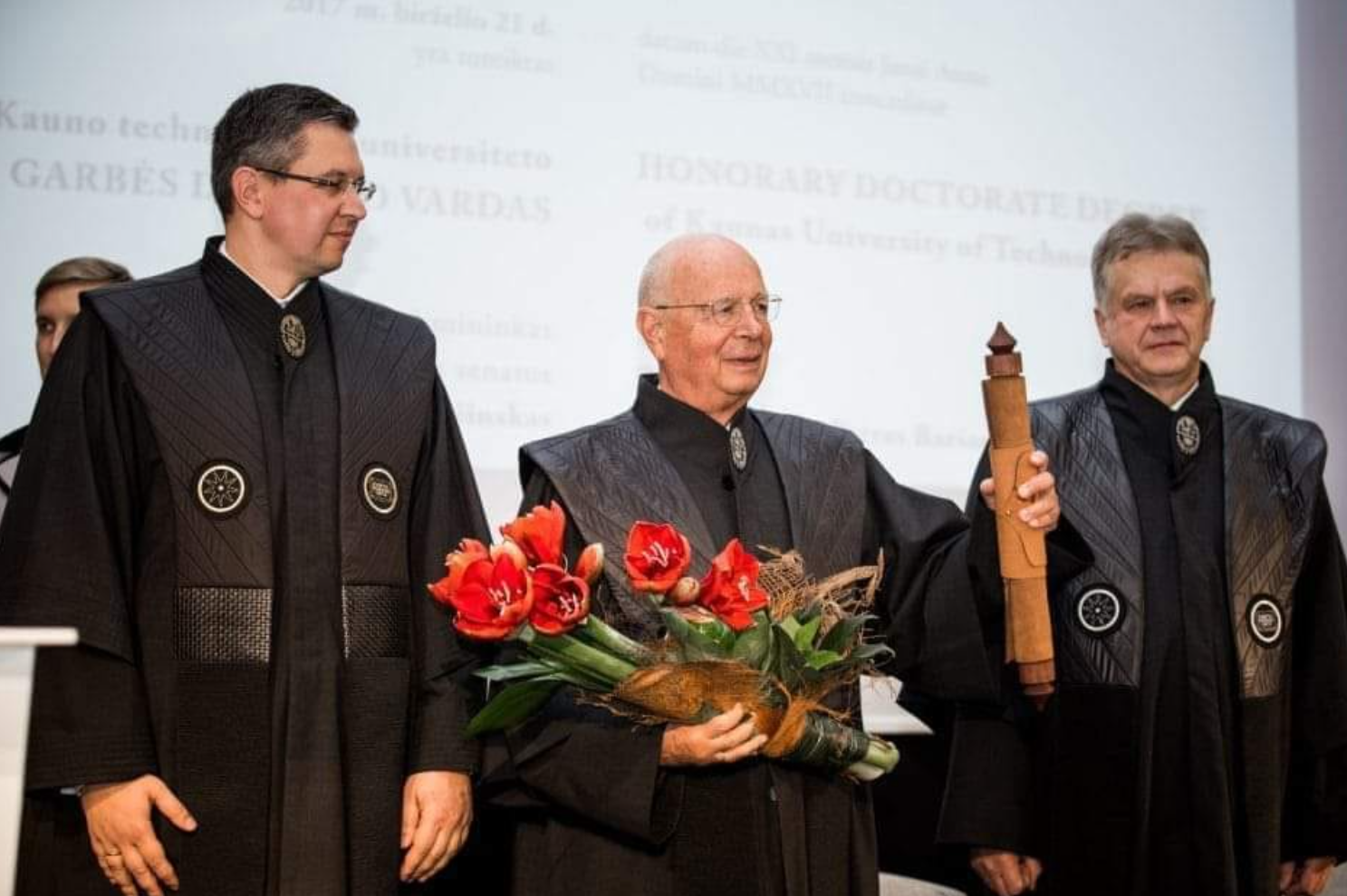 Jeg tror, billedet stammer fra Klaus Schwabs udnævelse til æresdoktor ved Kaunas Teknologiske Universitet, KTU, i Litauen: Davos Economic Forum founder visiting Lithuania – the Lithuania Tribune