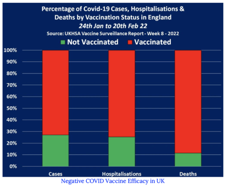 Negativ Vaccine Effektivitet er i al korthed, når vaccinerede er mere tilbøjelige til at blive syge, hospitalsindlagte eller dø end uvaccinerede. 92.4 % af alle Covid-døde i England er nu vaccinerede. Det er nu den dokumenterede situation i Storbritanien ifølge regeringens ugentlige Covid-statistik UKHSA. Det er givetvis det samme i hele den vaccinerede del af verden.