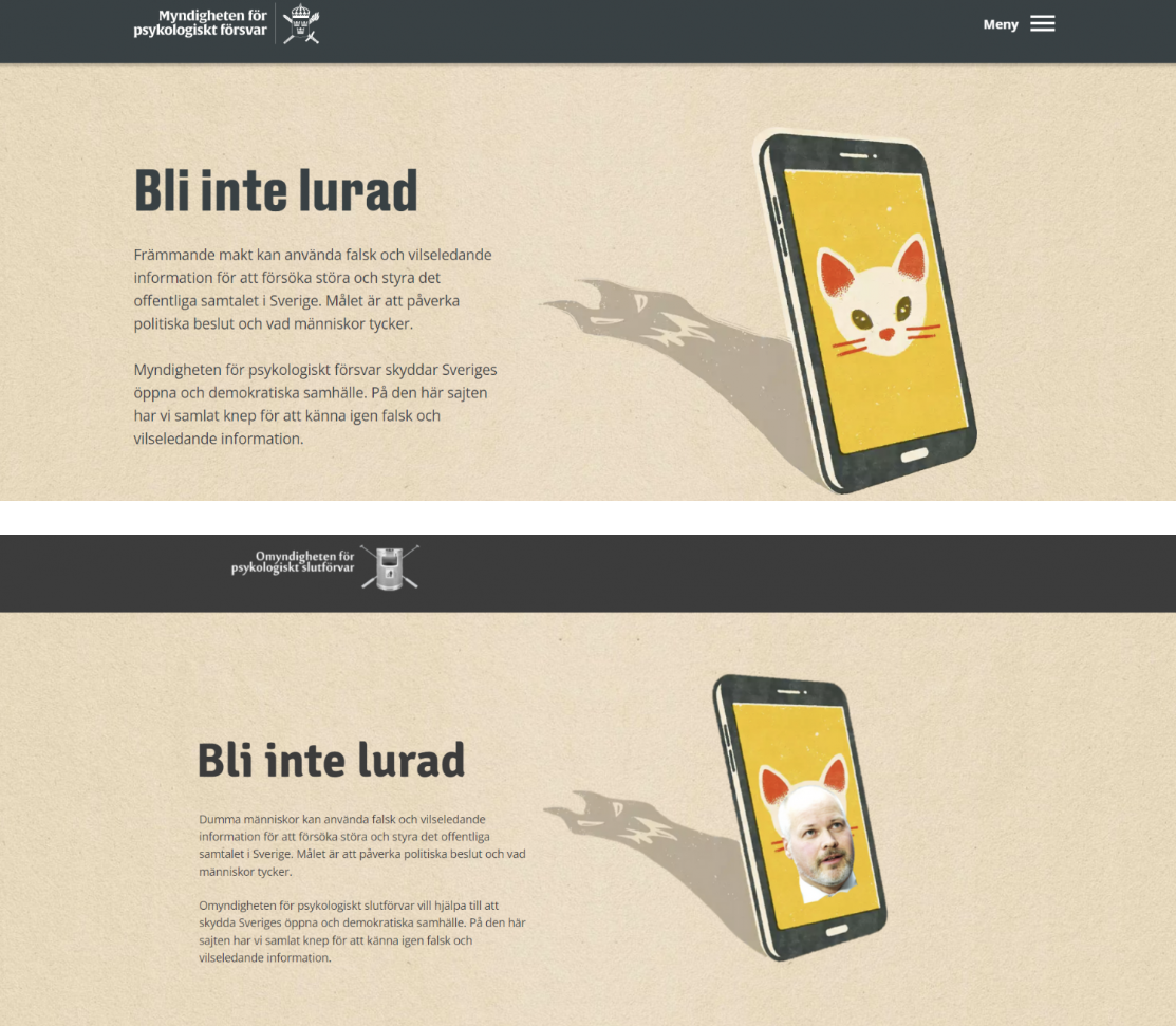 Så hva gjorde den nye myndigheten for å motvirke fremmed makt? Vel, de lanserte en stor reklamekampanje som nå ruller i T-banen, på bussholdeplasser og på reklametavler, en kampanje som advarer om faren ved humor. Men myndigheten nøyde seg ikke med dét. Den lanserte også siden bliintelurad.se, hvor besøkende ønskes velkommen slik: