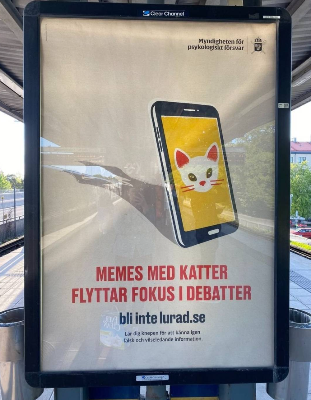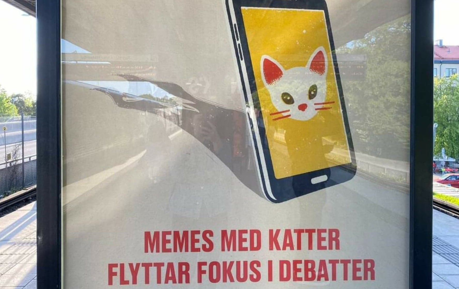 Myndigheten för psykologiskt försvar, advarer mot memer med katter. Her på en t-baneplattform i Stockholm. Foto: Privat