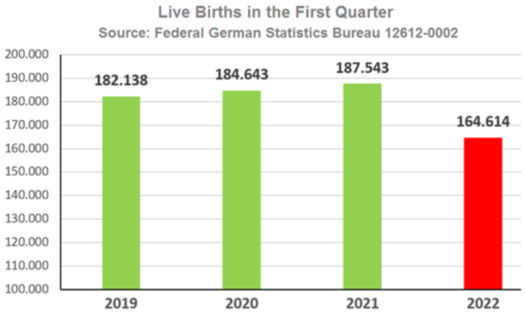 The number of live births in Germany has apparently decreased drastically in the first months of 2022. According to provisional figures from the Federal Statistical Office (Destatis), 164,614 children were born in the first quarter of the year. [Want to bet that these are of migrant stock?] In the same period of 2021, the statisticians recorded 187,543 live births. This corresponds to a decrease of more than twelve percent. In previous years, the numbers were comparatively stable.