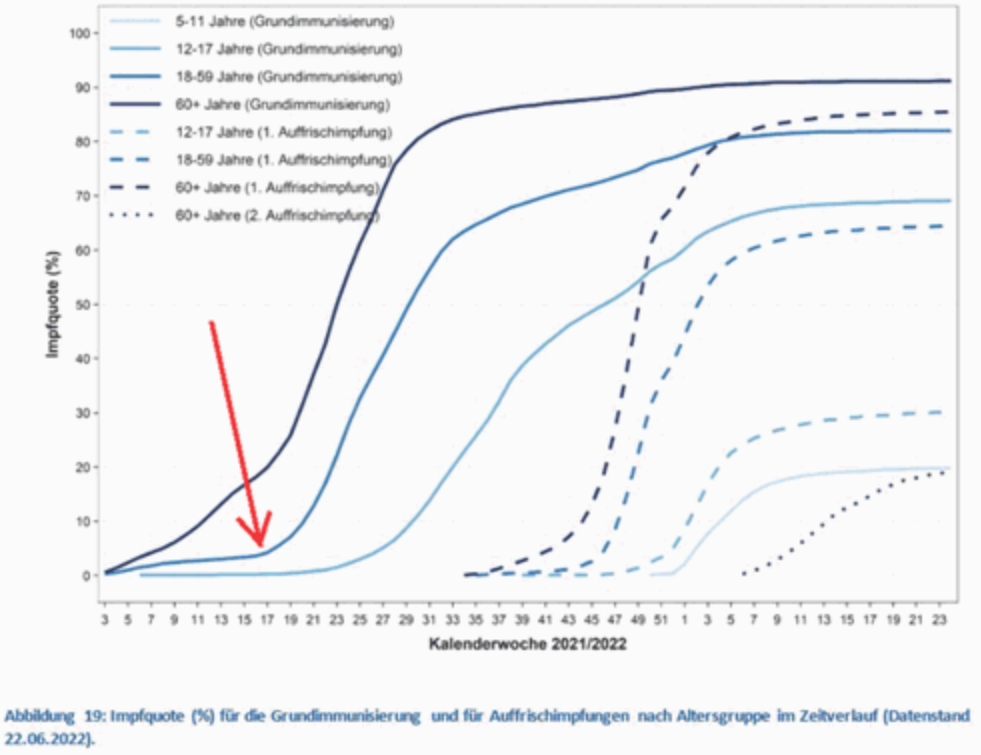 “In this RKI graphic from the last weekly report, the arrow marks the age group 18 to 59 years, which is responsible for the majority of births. From calendar week 2021/17, i.e. around nine months before the first quarter of 2022, the curve rises steeply.”