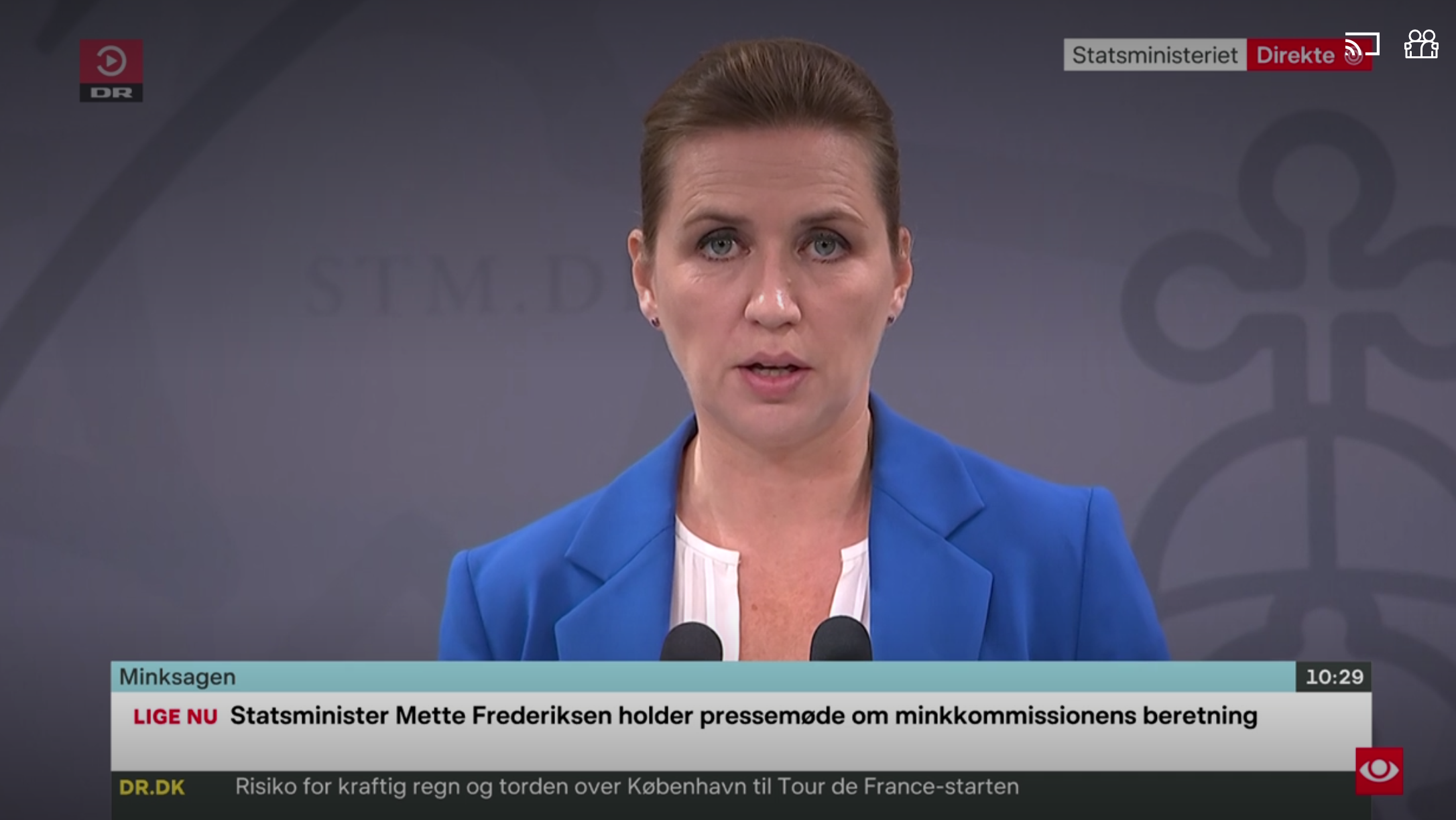 “Statsministeren var i en direkte TV-udsendelse på TV2 – Go’ aften Live – den 12. november 2020. I udsendelsen havde man netop talt med statsministeren om, at der var begået fejl, da der ikke var hjemmel til at kræve aflivning, hvorefter hun af en minkavler blev spurgt, om de kunne få lov til at beholde nogle af deres dyr. Statsministeren svar var: ”Det korte svar er: ”Nej”.”