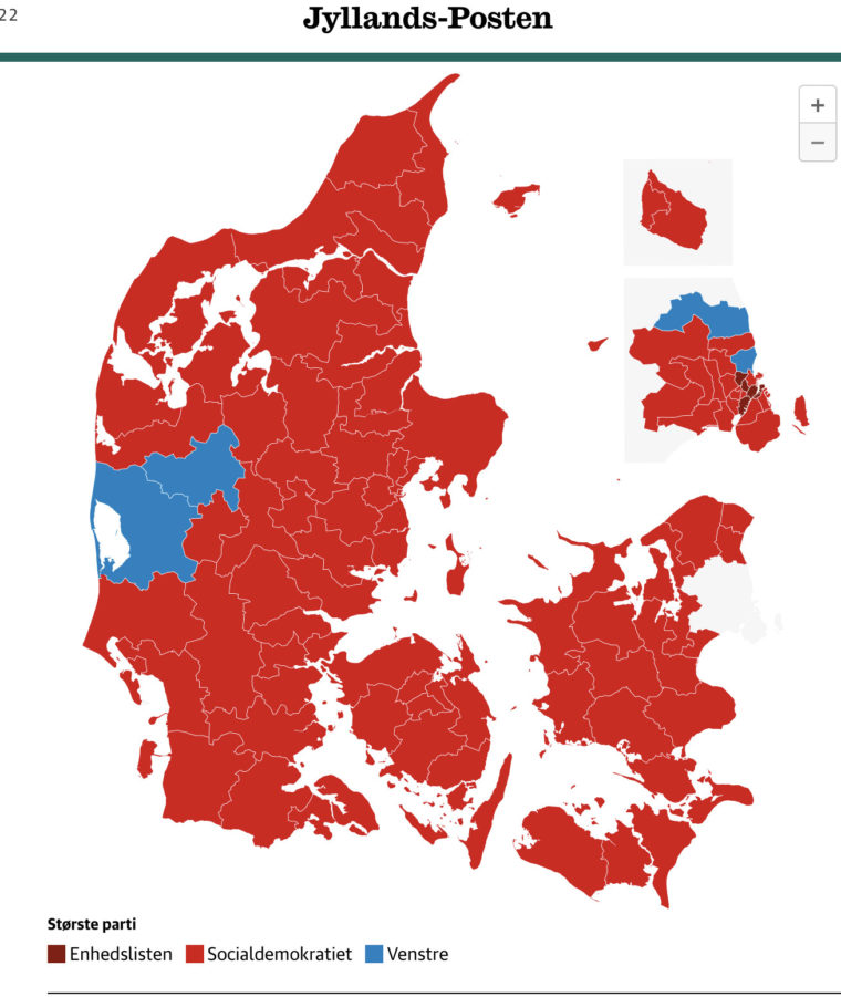 Kortet virker også for iscenesat. De “blå” er selvfølgelig de rige svin i Nordsjælland og så lige bøverne, de der bor så langt ude, de selv må holde hankat. Er et hélt blodrødt Nordjylland virkelig muligt? Det stinker, som et iscenesat forsikringsindbrud, hvor de væltede møbler er overdramatiseret.