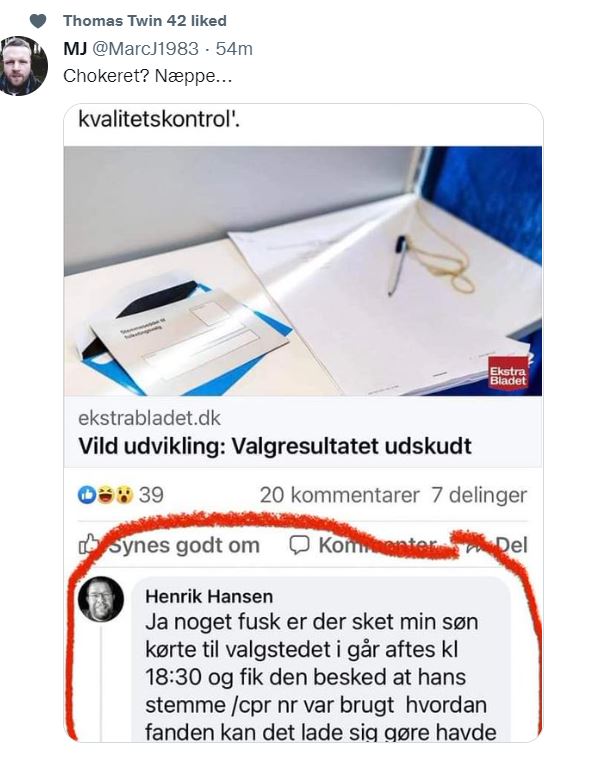 Så er der vist ingen tvivl om at der er blevet snydt længere: https://ekstrabladet.dk/nyheder/politik/danskpolitik/s-overrasker-i-nordjysk-minklandsby/9497470 Vi taler om et erhverv hvor flere har begået selvmord på grund af regeringens handlinger, samt mange andre store konsekvenser. Og så skal vi tro på at en lille minkavler landsby stiller sig i kø for at stemme på gerningsmændene?? Jeg tror de er gået for langt denne gang, præcist som i usa. INGEN med mere end 2 hjerneceller kan tro på det der, så del den artikel overalt hvor der er danskere der trænger til et reality check og spørg dem om de syntes at… Read more »