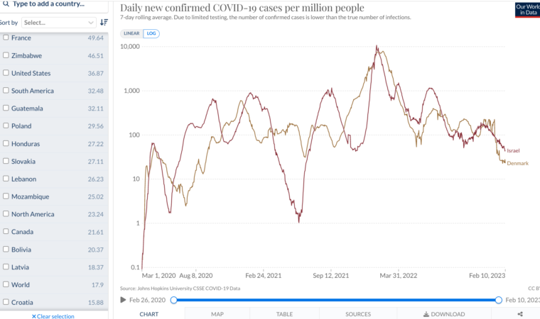 Her er Danmark sammenlignet med Israel, som er et af de mest vaccinerede lande i verden. Det ser skidt ud begge steder. Hvad mon det udvikler sig til, og hvilke søforklaringer vil vi få serveret? Klik ind på Our World in Data
