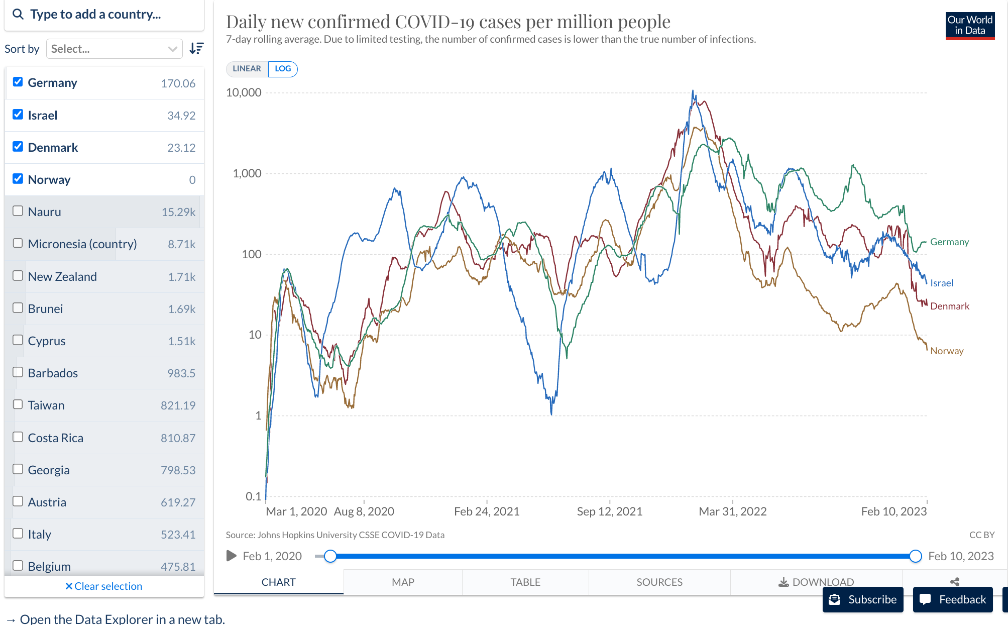 På kurven her, kan man se nogle af de værst ramte lande, Danmark, Tyskland, Israel og Norge. Statistik fra Our World In Data.