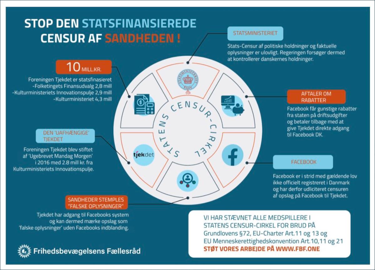 Hvis nogen fabler om, at “tjekdet” og andre propagandaredskaber kan afvise den vaccinerelaterede overdødelighed, så send dem dette “censurhjul”, som Frihedsbevægelsens Fællesråd, FBF, meget dygtigt og pædagogisk har sat sammen. Alle veje fører til statsmagtens interesser i samme censur: