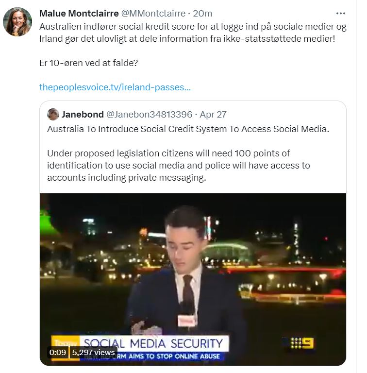 Irland gør det ulovligt at dele informationer fra ikke statsstøttede medier og Australien indfører social credit system, for at benytte sociale medier. China here we come, Sakset fra Twitter: