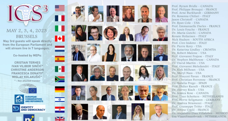 Det foregår i EU Parlamentet med deltagere som Christine Andersson, Ryan Cole, Arne Burkhardt, Kristian Terhes og Robert Malone.