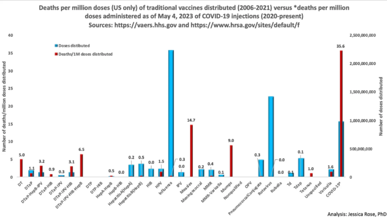 Man kan følge hendes Substack. Der kan man se denne grafik med relation til videoen. “Døde pr. millioner doser af forskellige vacciner.” Covid-vaccinen yderst til højre.