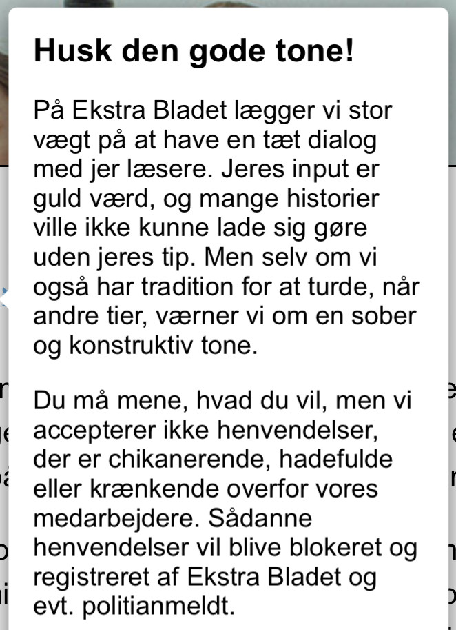 Apropos, så har ekstra bladet nu fået den her tekst der popper op hvis man klikker på en såkaldt journalists navn for at skrive til vedkommmende om indholdet i deres artikler. Jeg gætter på at ikke en eneste af dem tænker nærmere over hvorfor det var nødvendigt at indføre, men set herfra er det et sundhedstegn når de værste medier må skærme sig selv yderligere fra den befolkning som de dagligt lyver overfor: