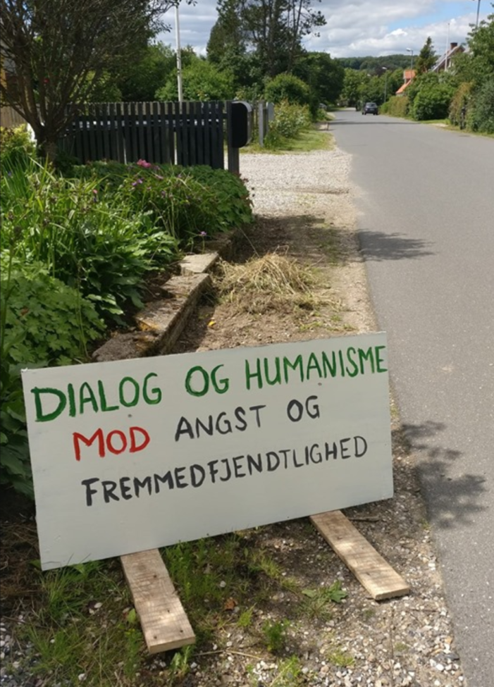 Det var i 2019 på vej til folkefesten på Mosbjerg, at jeg måtte hakke bremserne i da jeg kørte gennem landsbyen Alken på nordsiden af Mossø. Alken er en stationsby mellem Skanderborg og Herning beboet af 235 sjæle. Jeg måtte have et billede af denne tekst. Jeg tror, afsenderen hed “Foreningen Alken mod fremmedfjendtlighed,” og de “fremmedfjendtlige” var jo os, der var på vej til Folkefest.