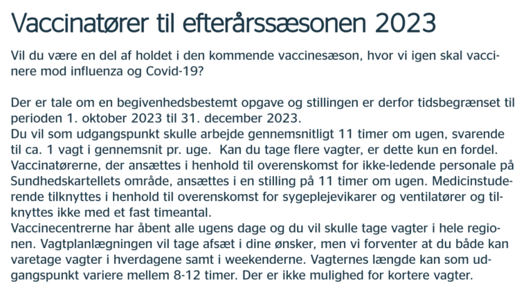 (Skærmbillede fra Jobnet.dk region Nordjylland. Se det hele.) Lad dig ikke snyde af influenzavacciner. Kun 28 % virker efter formålet, og snart er de baseret på mRNA og dermed risikable.