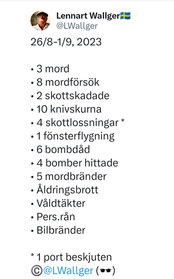 Med det tempo ødeleggelserne sker i Sverige bliver befolkningen passiv og sløv. Den har givet op. Tallene for en uge er hvad andre lande registrerer på over et år: