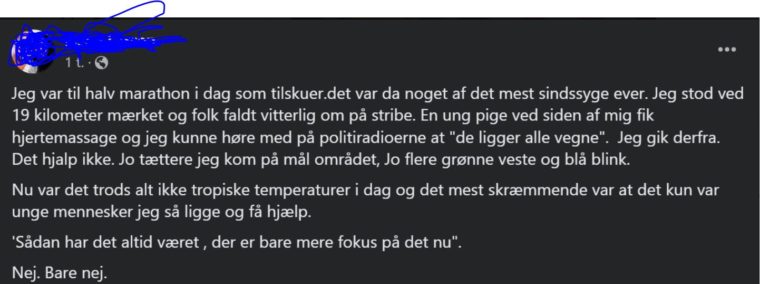Ham der skrev på Twitter, at han overværede vanviddet, skrev at han så en ung kvinde få hjertemassage. Mon hun så var den eneste? Tvivler.