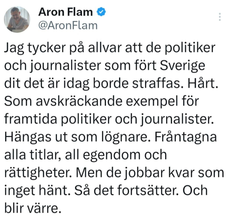 Det var ‘de forkerte, der fik ret,’ både i Sverige og Danmark. Sådan nogle som undertegnede, Jalving, Karen Jespersen. Der var ikke mange flere, heller ikke i Sverige. Derfor må de ikke få ret, men det er jo svært at skjule. Den tragiske komedie, der opføres i Sverige nu, viser magten fra dens ynkeligste side. Snart kan den via digital camouflage (censur), skjule, hvor ynkelig den er, for selvopfattelsen er, at den skal være fejlfri. Så store ulykker som denne, skal i al fald ikke forekomme.