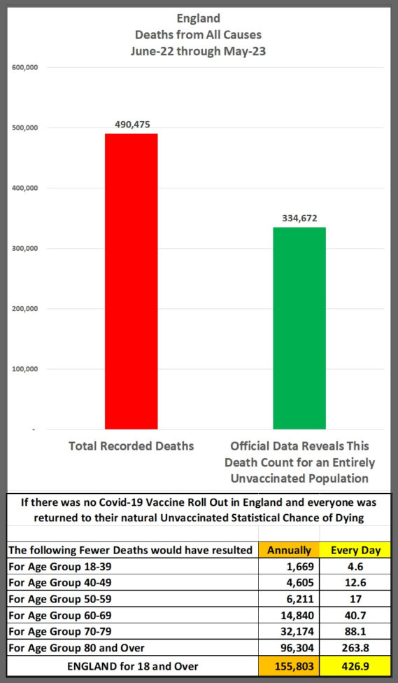 Synkroniseringen af de to statistikker, der giver disse tal, kan studeres nærmere på Substack’en ANNUS HORRIBILIS – In England – Over 155,000 Extra Deaths because of Covid-19 Vaccination Status.