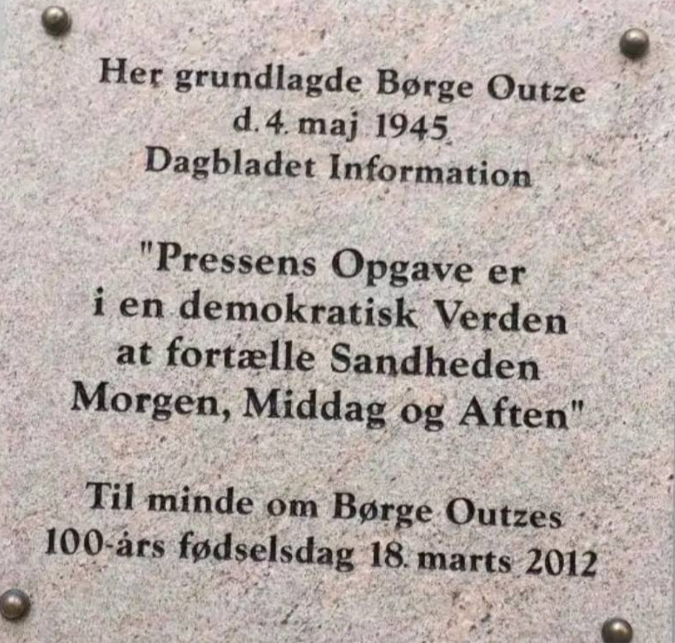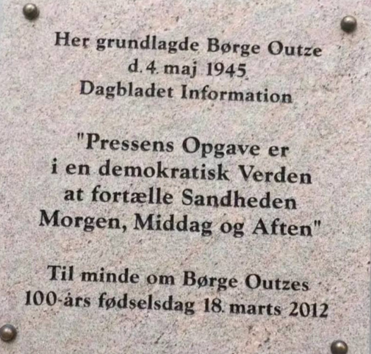 Når jeg ser billedet Outzes mindeplade, så tænker jeg umiddelbart på Berlingskes statement når de stopper min gratis læsning af netavisens artikler: “Undskyld afbrydelsen, men fri, ansvarlig journalistik er værd at betale for”.Jeg tænker hver gang at de har ret, og at det er ærgerligt at Berlingeren hverken er fri eller sandfærdig.