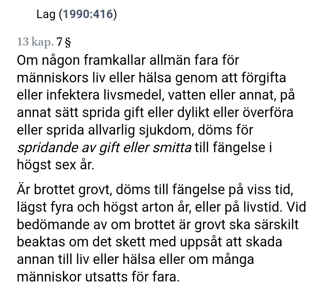 Den svenske Brotsbalken kapital 13 paragraf 7. Jeg går ud fra, vi har en lignende bestemmelse i Danmark. Den er op til livsvarigt fængsel.