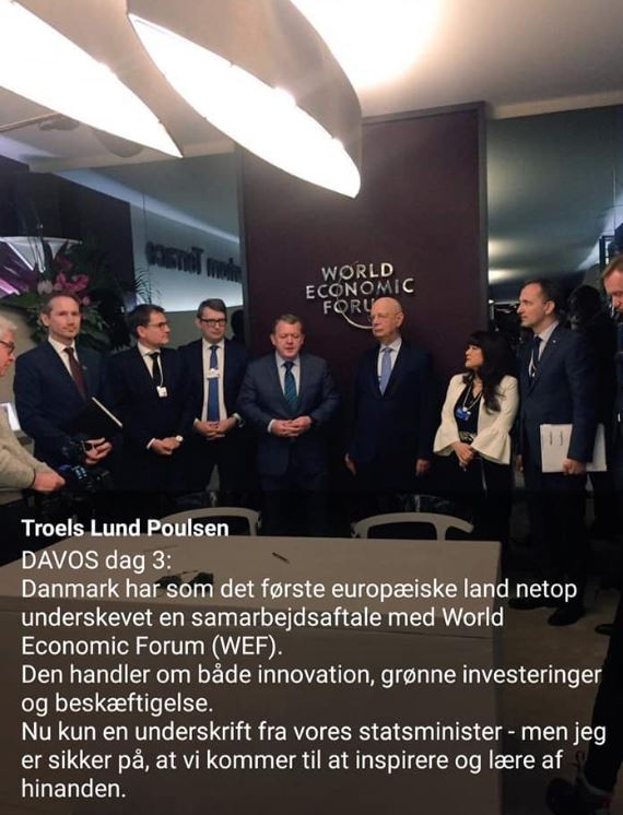 Det er SÅ kompromitterende. Jeg har set en liste, hvor over 100 folketingsmedlemmer har EN eller anden forbindelse til WEF. Det er en skandale, der kun kan passere fordi medierne er lige så købte og korrupte, at de ikke unne drømme om at informere ordentligt om det. Stille og roligt kører denne elite helt uden om befolkningen og forærer enhver politisk magt væk, vi burde have