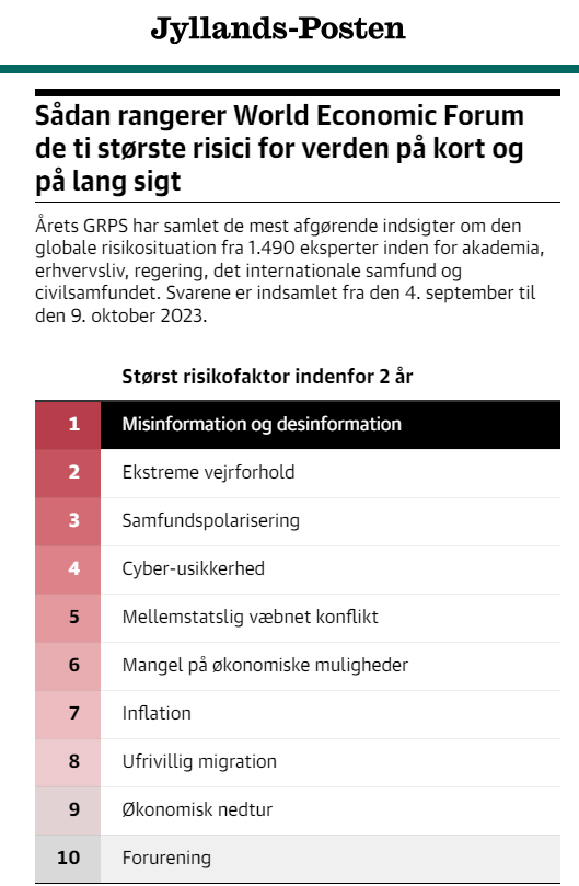 Jyllands Postens nye chefredaktrice har en interessant artikel i dag om de største farer, der truer os. Den STØRSTE af alle er………..”misinformation og desinformation”. Det har World Economic Forum nemlig regnet ud. Sjovt som folk, der selv er de værste til noget, altid beskylder andre for akkurat det samme. Jeg kunne nævne de første ti ting, som medierne groft misinformerer om. For ikke at tale om løgnefabrikken og vaccinemorderne WEF: Misinformation er vores værste fjende World Economic Forum har forsøgt at opgøre de største fælles risici for verden. I år er det en meget uhyggelig trussel, der topper listen, og… Read more »