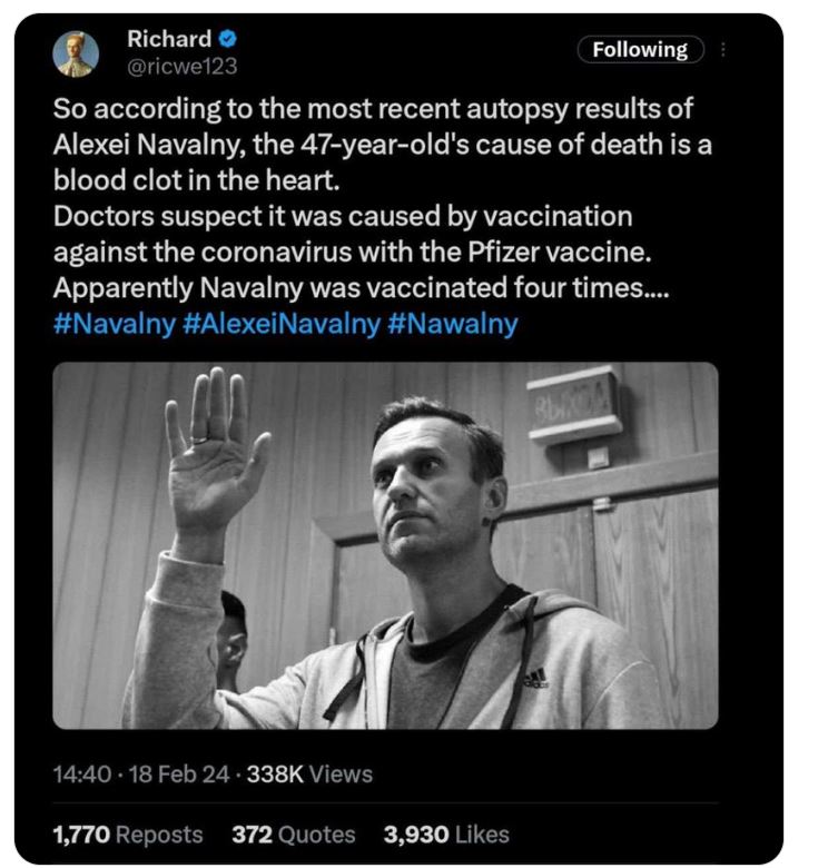 Han var i forvejen syg, måske efter en Covid sprøjte i München, og måske medvirkede MI6 til at aflive ham. Man ser let, at han kan bruges i den standende krigspropaganda, der udveksles mellem Nato-landene og Rusland