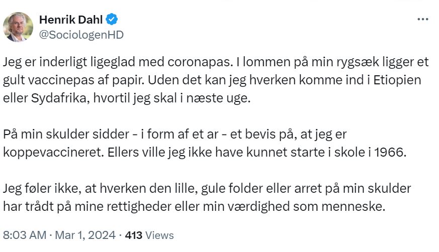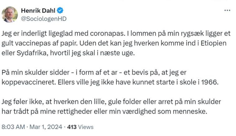 Enkelte har spurgt mig, hvorfor jeg har gjort så meget ud af “vaccinerne” i næsten tre år. Jeg skal besvare det så kort som muligt. Jeg ser ikke noget vigtigere og tydeligere symptom på globalismens kriminalitet, selvom jeg udmærket ved, at det kun er en del af den buket, de vil udsætte os for i disse år. Der er masseindvandring, klima, digital valuta, angrebene på europas demokrati og dets bønder, og talrige andre ting, men dette er det værste, fordi det opløser os moralsk. Det går over en grænse for ondskab og barbari, Europa ikke har passeret siden nazismen.