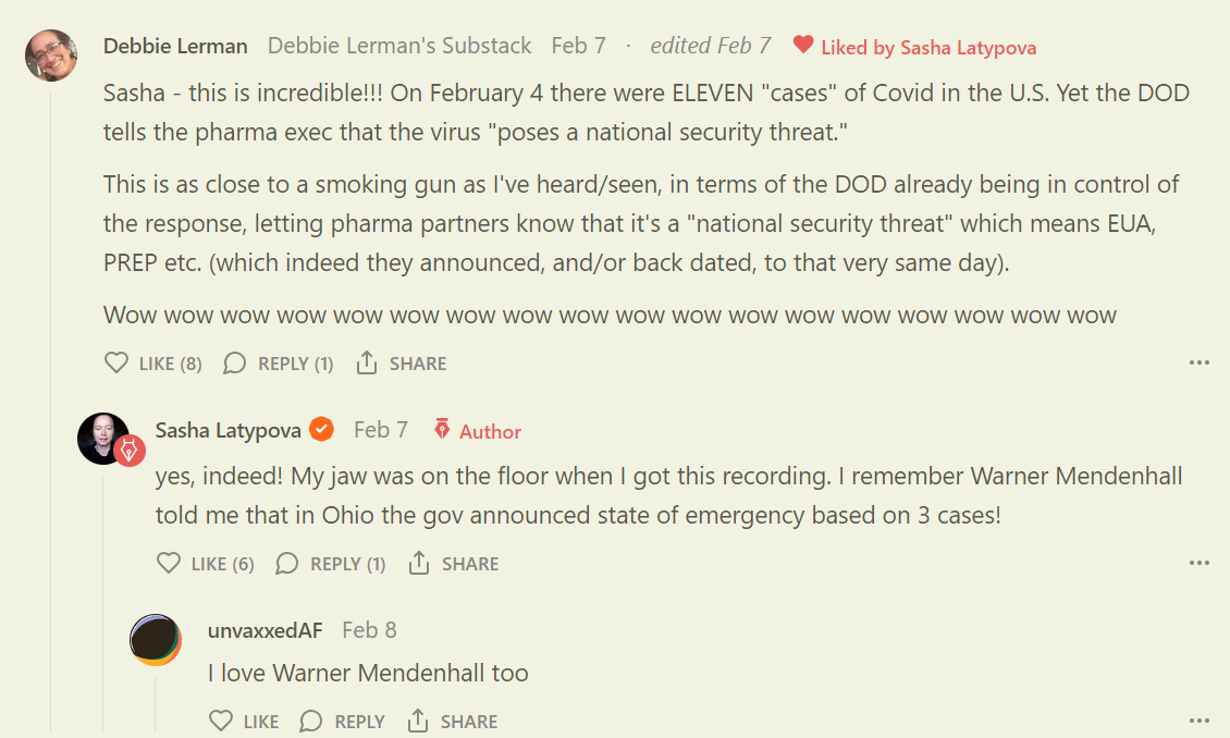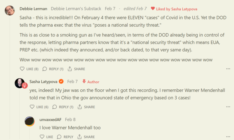 Pentagon [DOD = Department Of Defence] karakteriserede den 4 februar 2020 “den nye covid-virus som en national sikkerhedstrussel.” Da var der 11 tilfælde i hele USA. I Ohio erklærede man undtagelsestilstand på basis af 3 tilfælde. Sasha Latypova tidligere R & D, (Research and Development) i medicinalindustrien er kommet i besiddelse af en optagelse, der er så tæt på en rygende pistol, som den kan være. Kom igen med “konspirationsteorierne.”