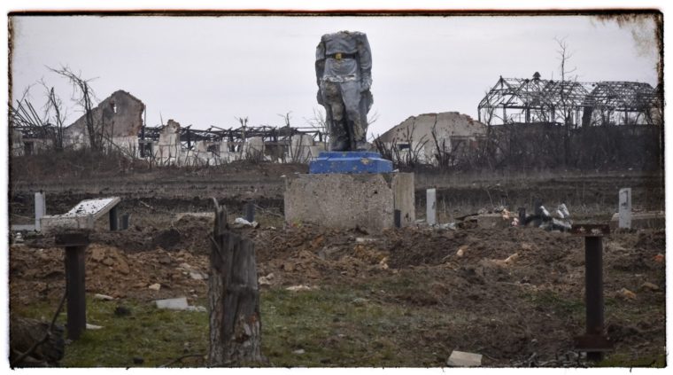 A destroyed monument to the WWII Unknown soldier stands headless in the central square in village of Robotyne, after heavy battle with Russian troops in Zaporizhzhia region, Ukraine, Friday, March 1, 2024. (AP Photo/Andriy Andriyenko)