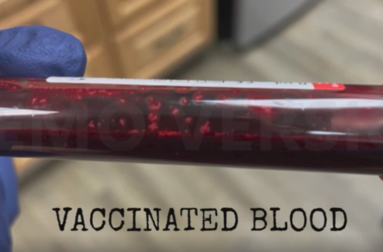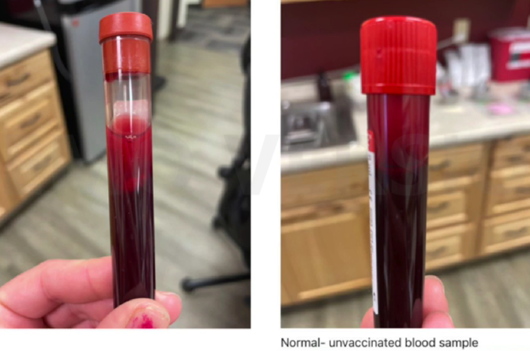 Justin Leslie får tilsendt to blodprøver fra en bedemand. Når man ser den granulerede, vaccinerede, forstår selv en lægmand, at japanske forskere nu forleden advarede mod blodtransfusioner med vaccineret blod. Vi har set dette på video, når en dråbe blod får tilsat Covid-vaccine og lægges under et mikroskop. (Skærmbilleder fra dokumentaren)